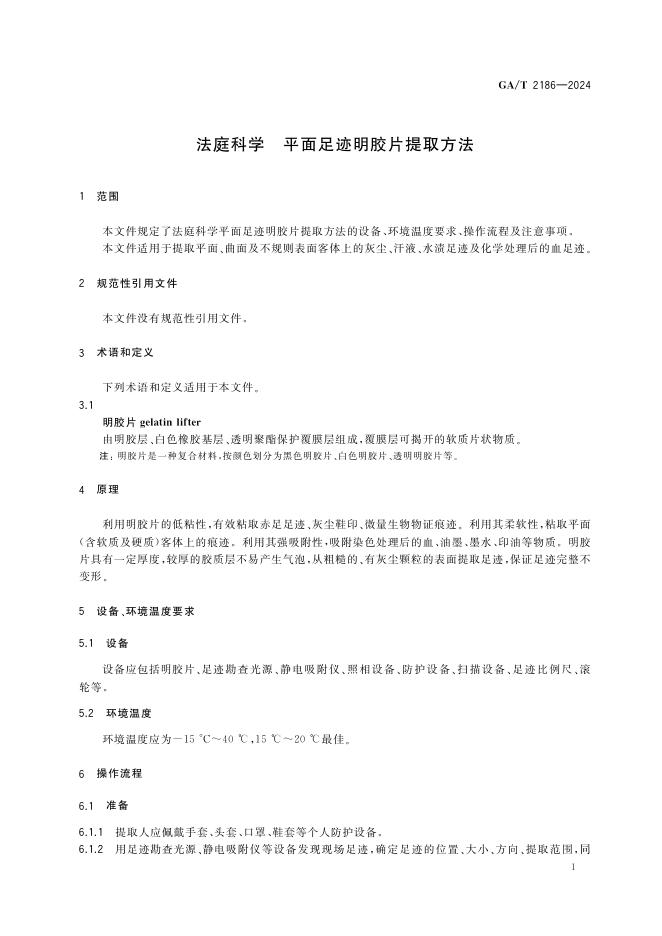 GA/T 2186-2024 法庭科学 平面足迹明胶片提取方法