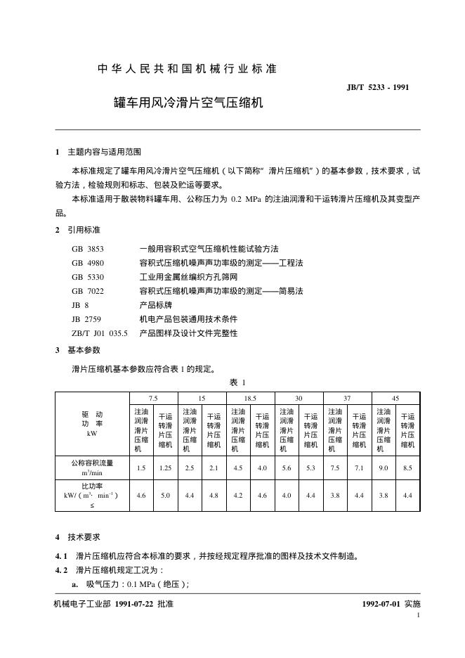 JB/T 5233-1991 罐车用风冷滑片空气压缩机
