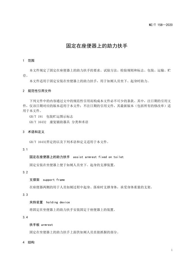 MZ/T 158-2020 固定在座便器上的助力扶手