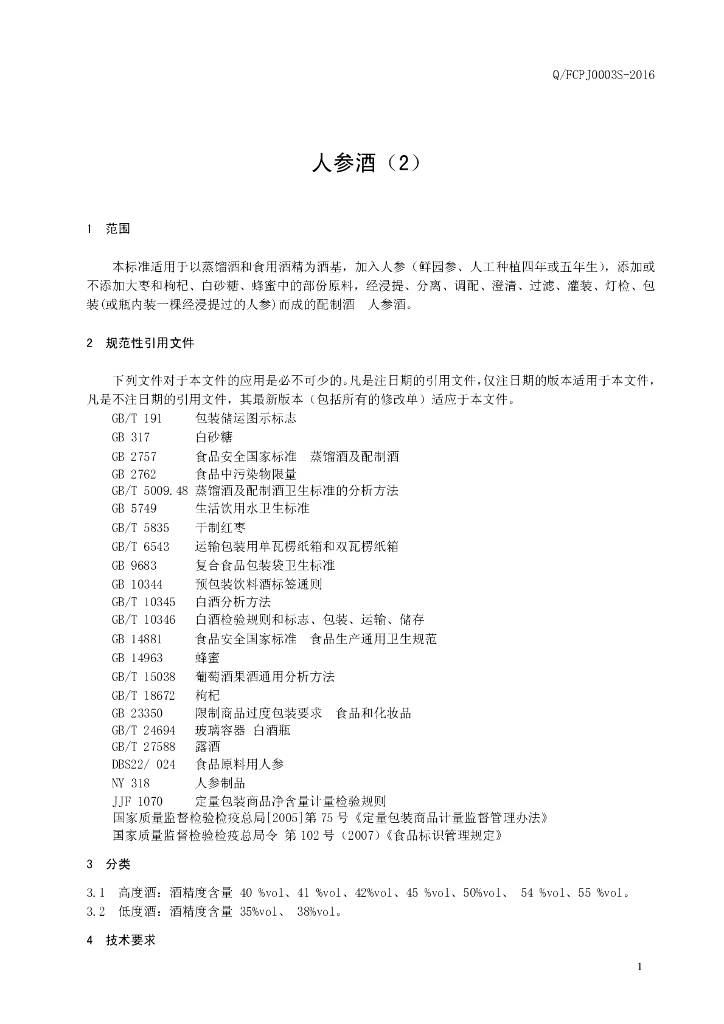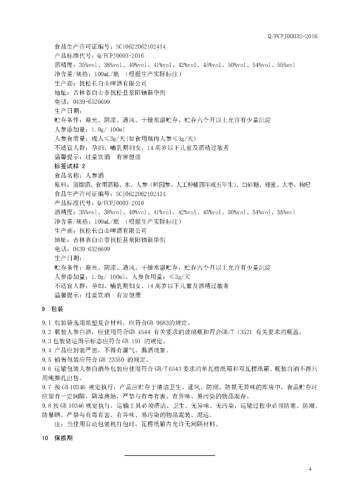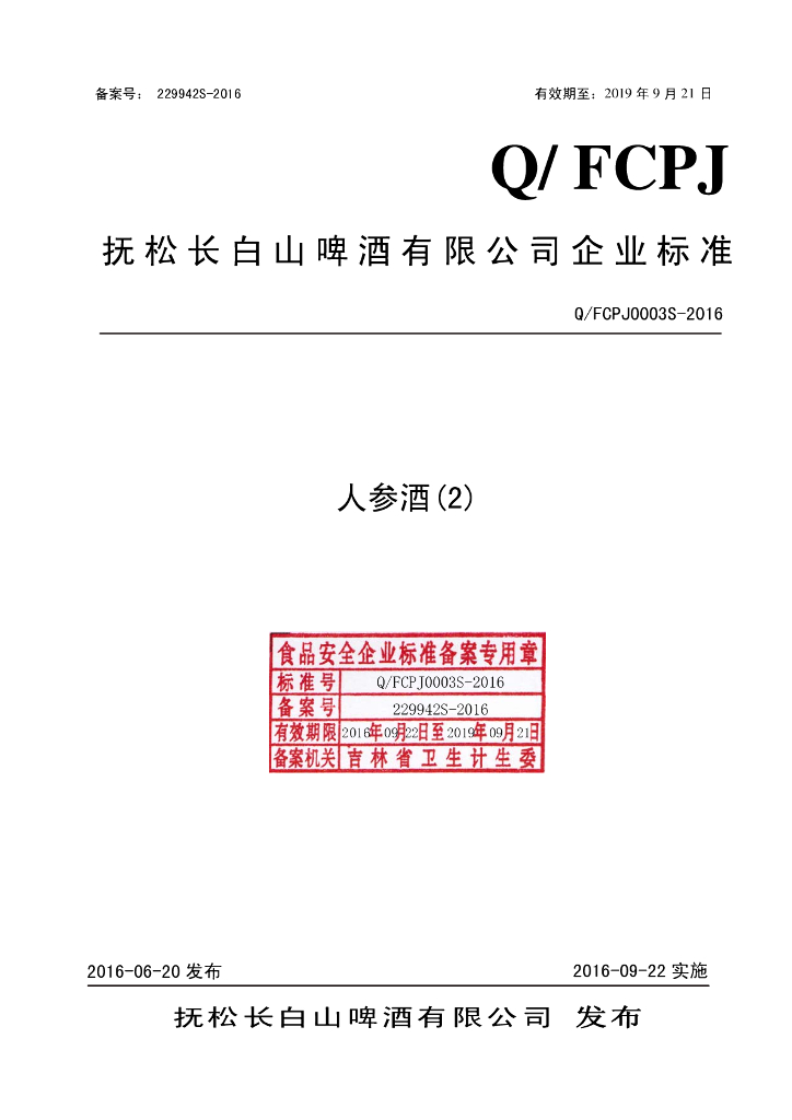 Q/FCPJ 0003S-2016 抚松长白山啤酒有限公司 人参酒(2)
