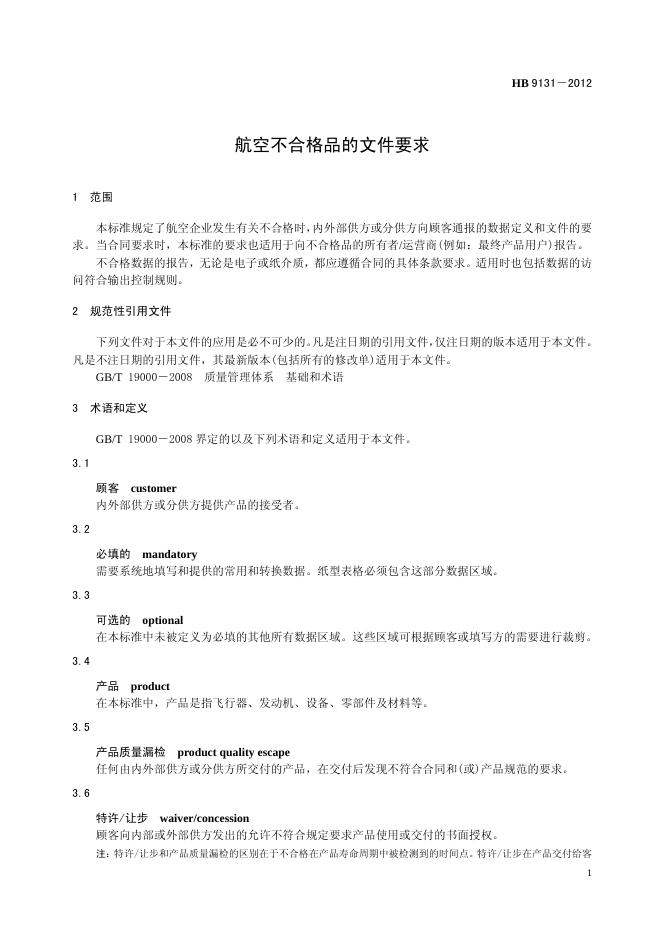 HB 9131-2012 航空不合格品的文件要求