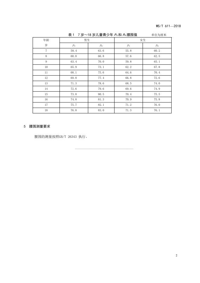 WS/T 611-2018 7~18岁儿童青少年高腰围筛查界值