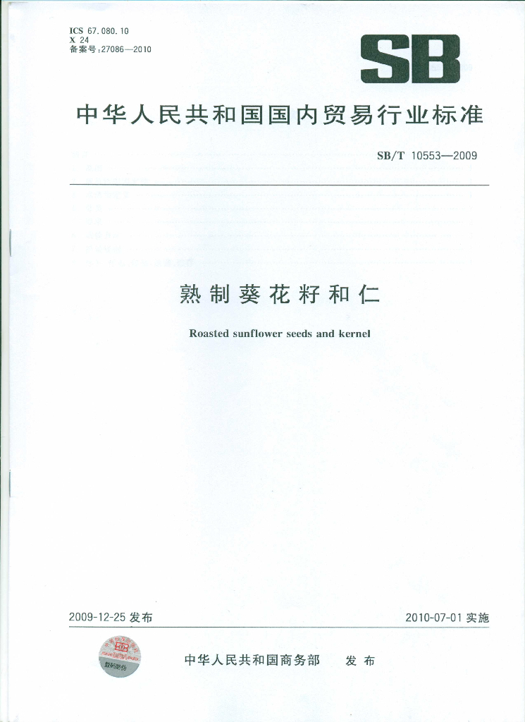 SB/T 10553-2009 熟制葵花籽和仁