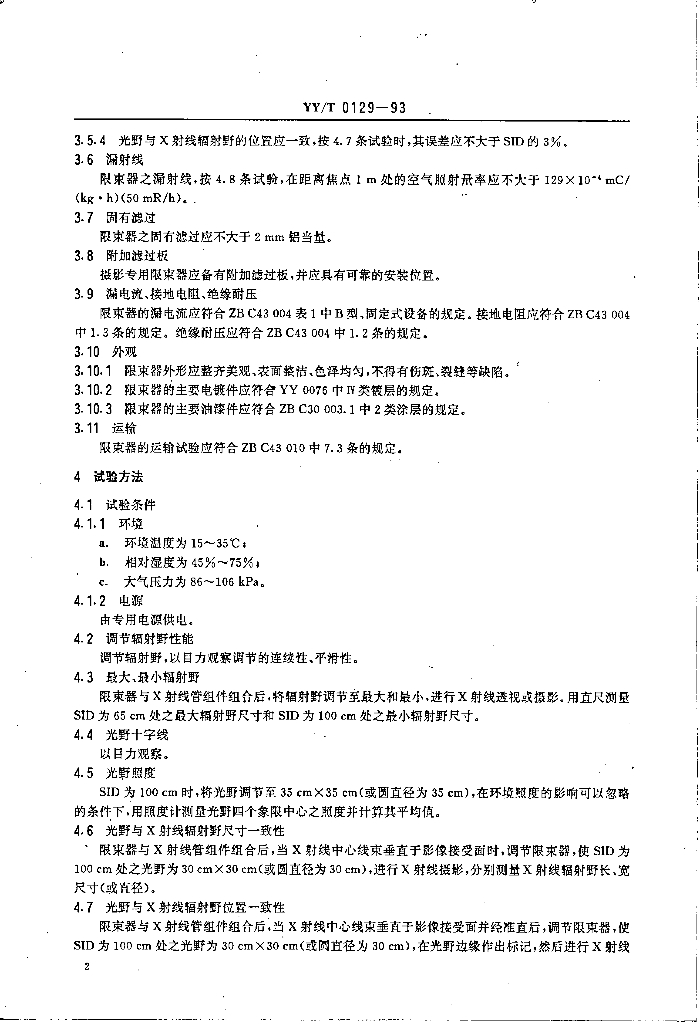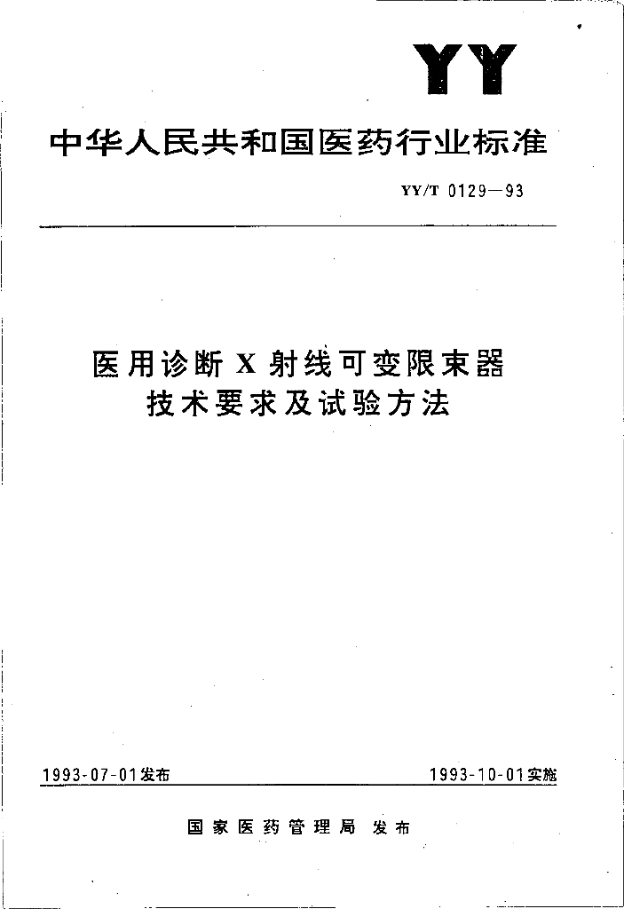 YY/T 0129-1993 医用诊断X射线可变限束器技术要求及试验方法