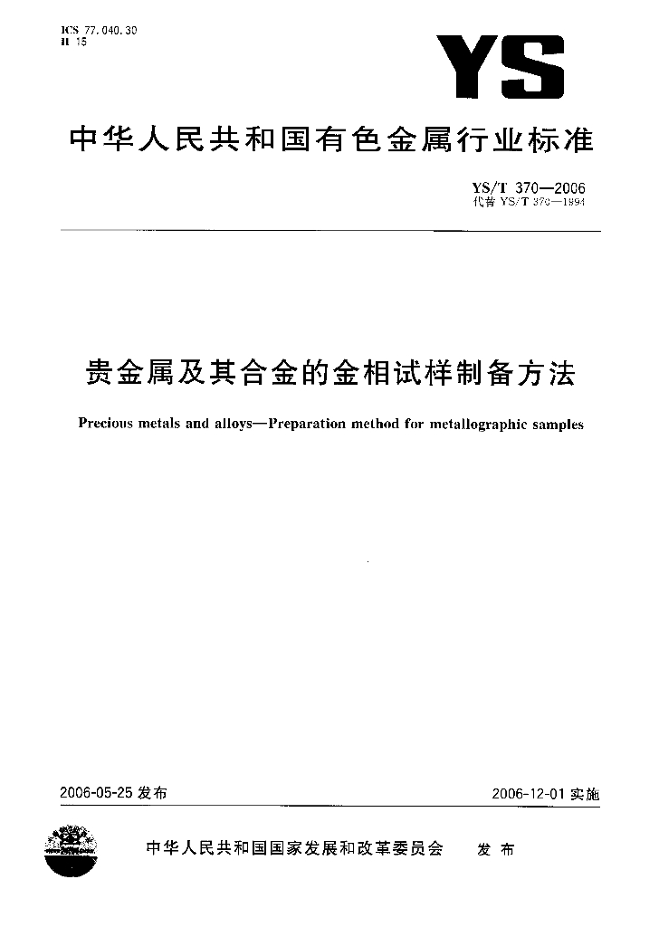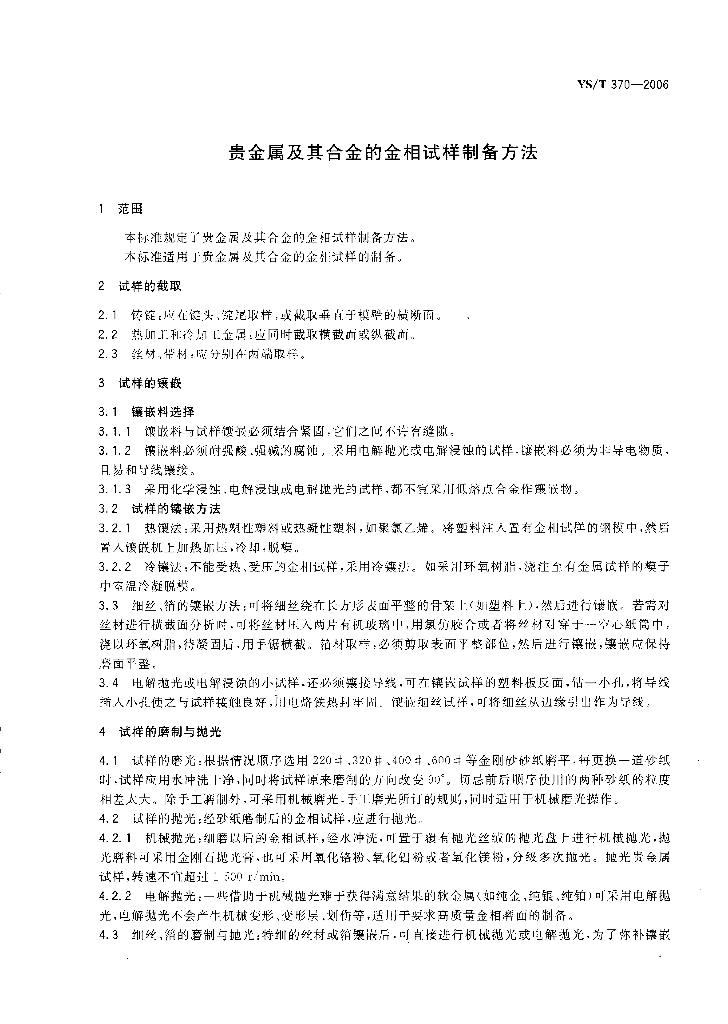YS/T 370-2006 贵金属及其合金的金相试样制备方法
