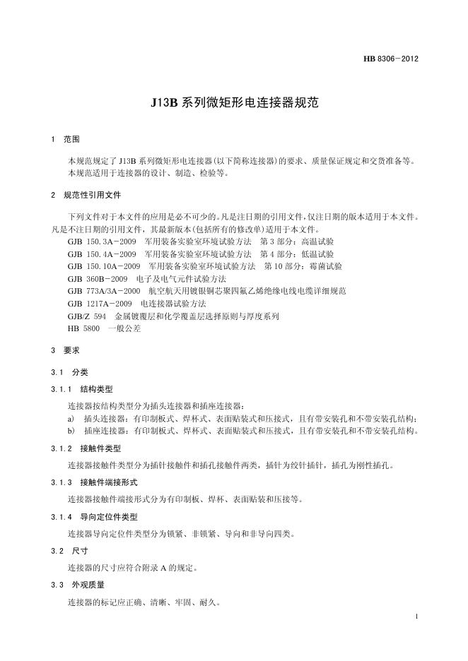 HB 8306-2012(2017) J13B系列微矩形电连接器规范