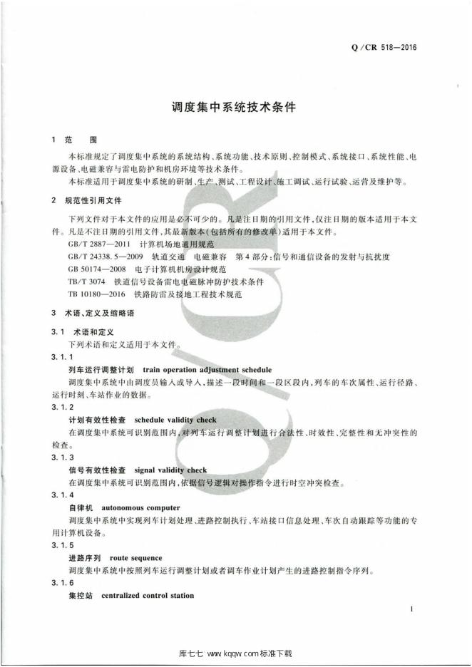Q/CR 518-2016 调度集中系统技术条件