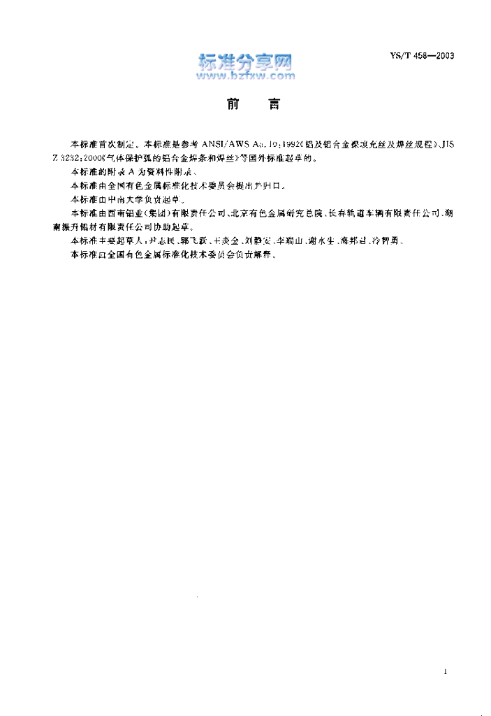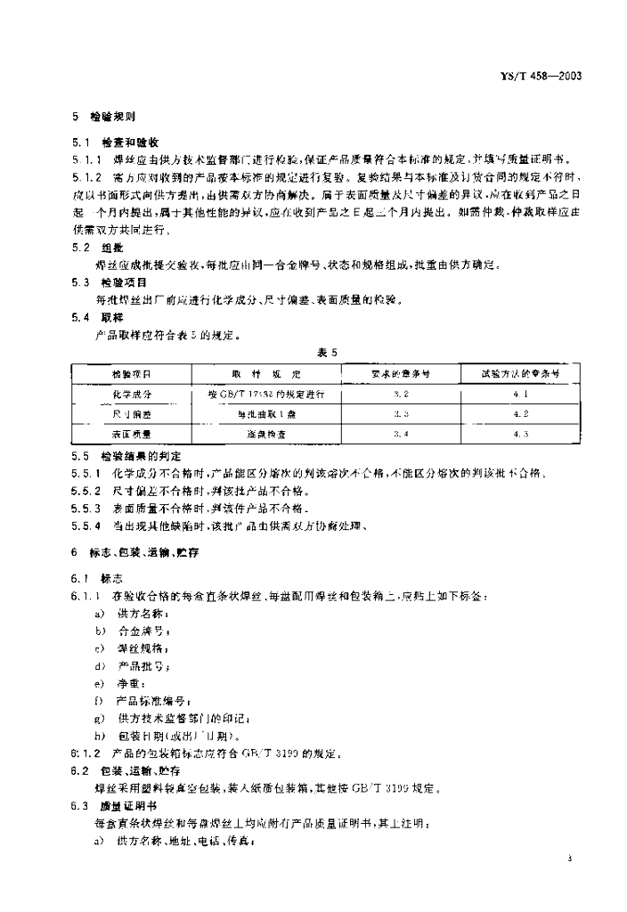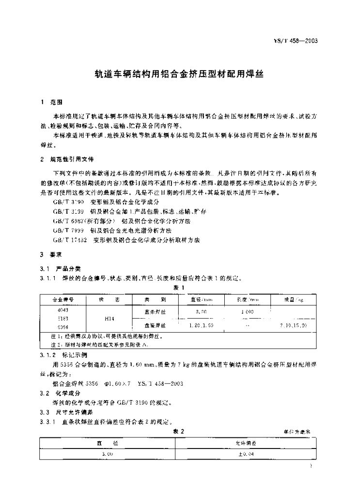 YS/T 458-2003 轨道车辆结构用铝合金挤压型材配用焊丝