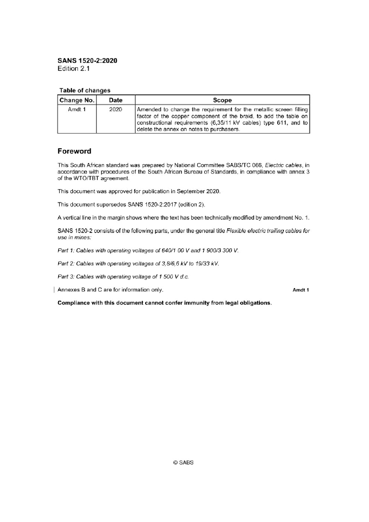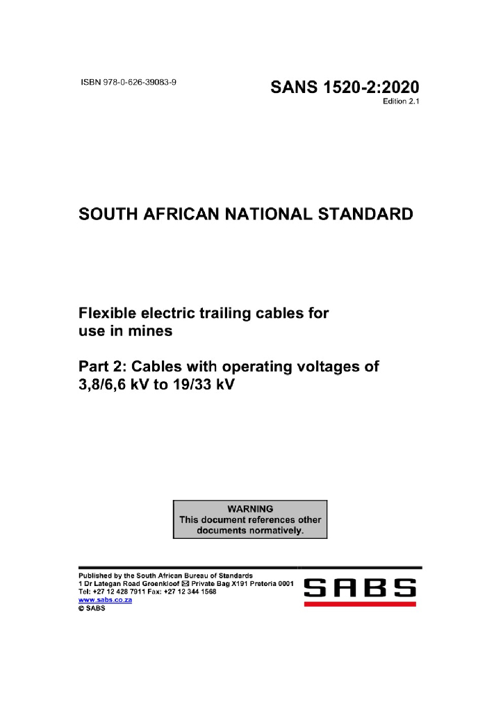 SANS 1520-2:2020 矿用拖拽软电缆 第2部分:高压电缆(3,8 6,6kV to 19 33kV)
