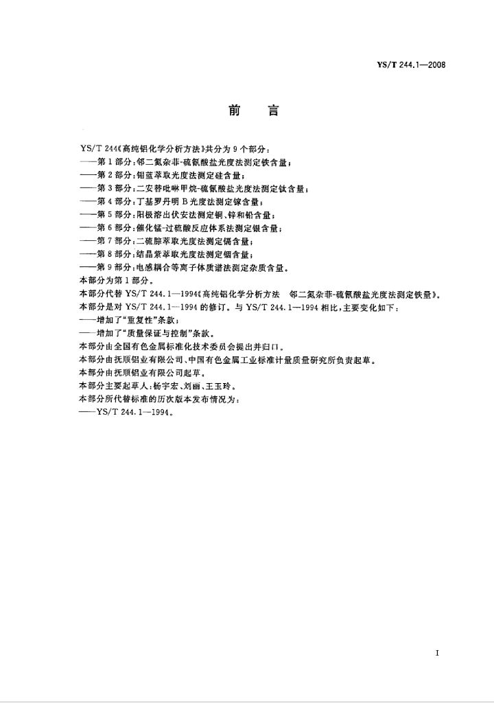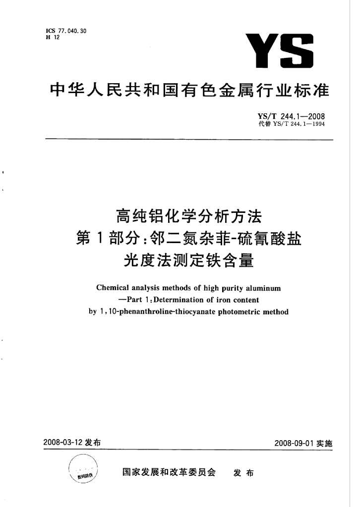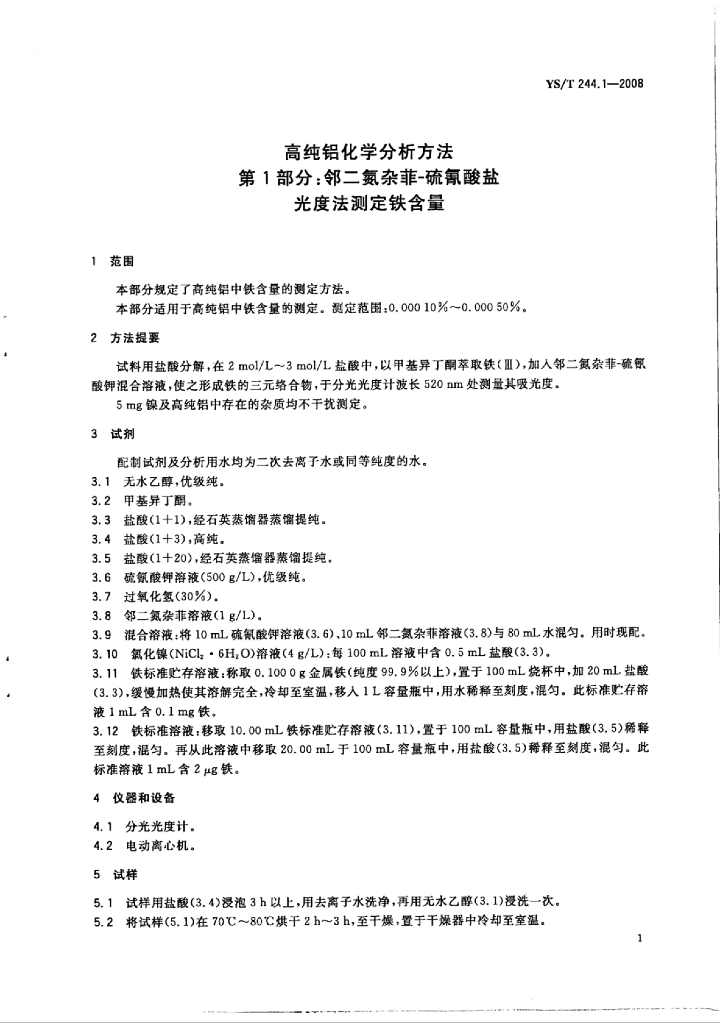 YS/T 244.1-2008 高纯铝化学分析方法 第13部分:邻二氮杂菲-硫氰酸盐光度法测定铁含量