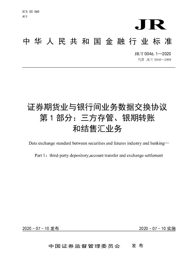 JR/T 0046.1-2020 证券期货业与银行间业务数据交换协议 第1部分:三方存管、银期转账和结售汇业务