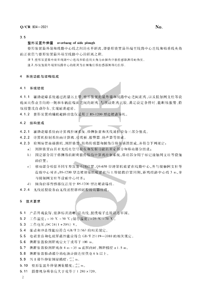 Q/CR 834-2021 铁路大型养路机械 污土带辅助避障系统