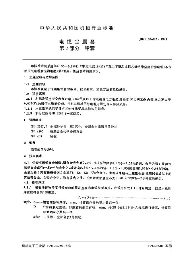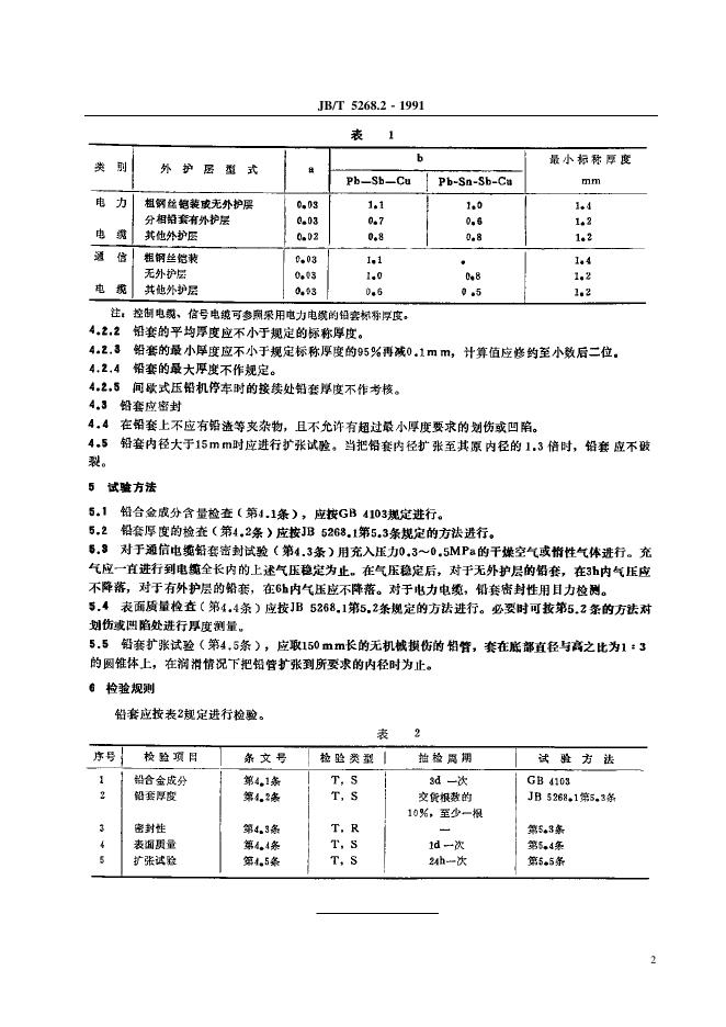 JB/T 5268.2-1991 电缆金属套 第二部分 铅套
