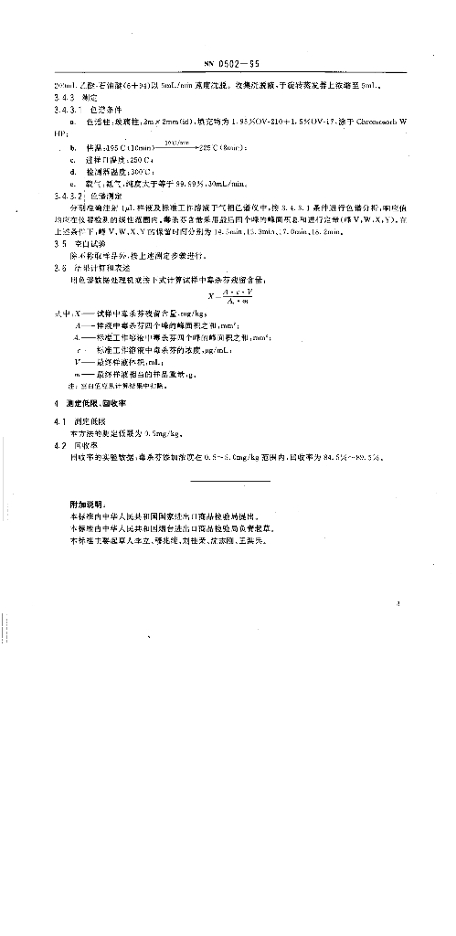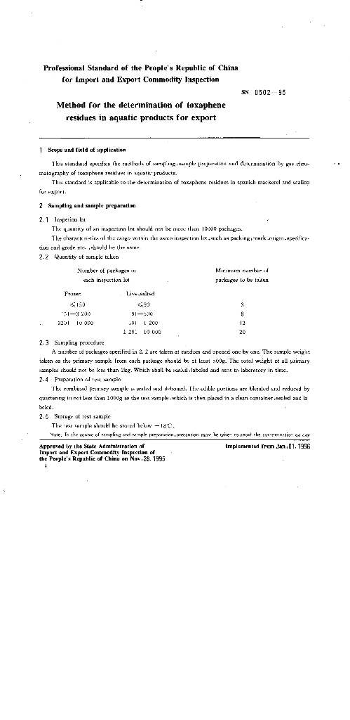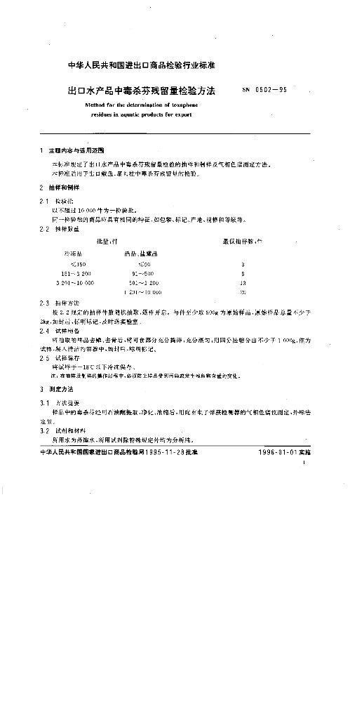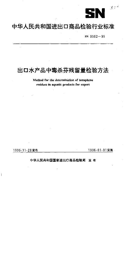 SN 0502-1995 出口水产品中毒杀芬残留量检验方法