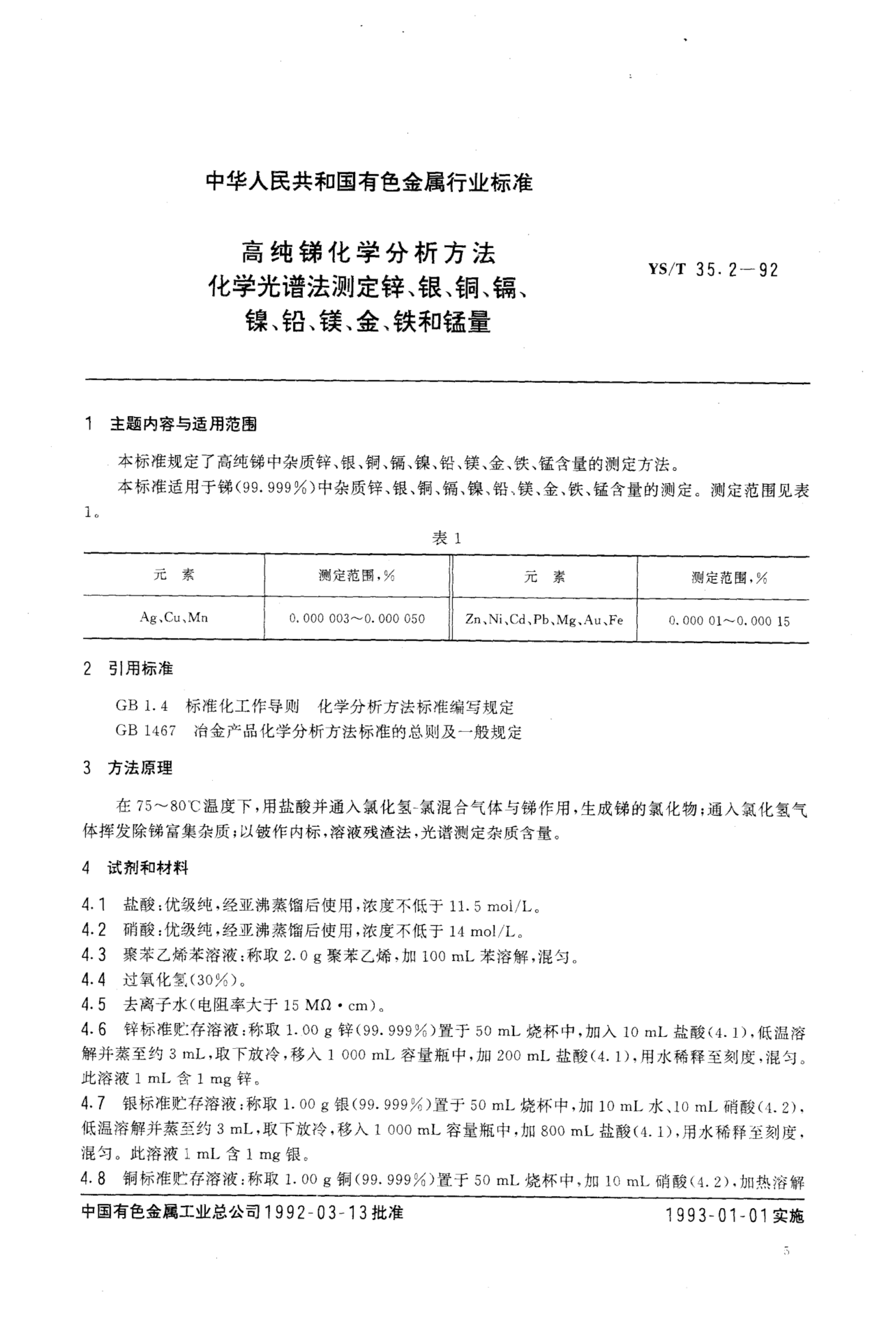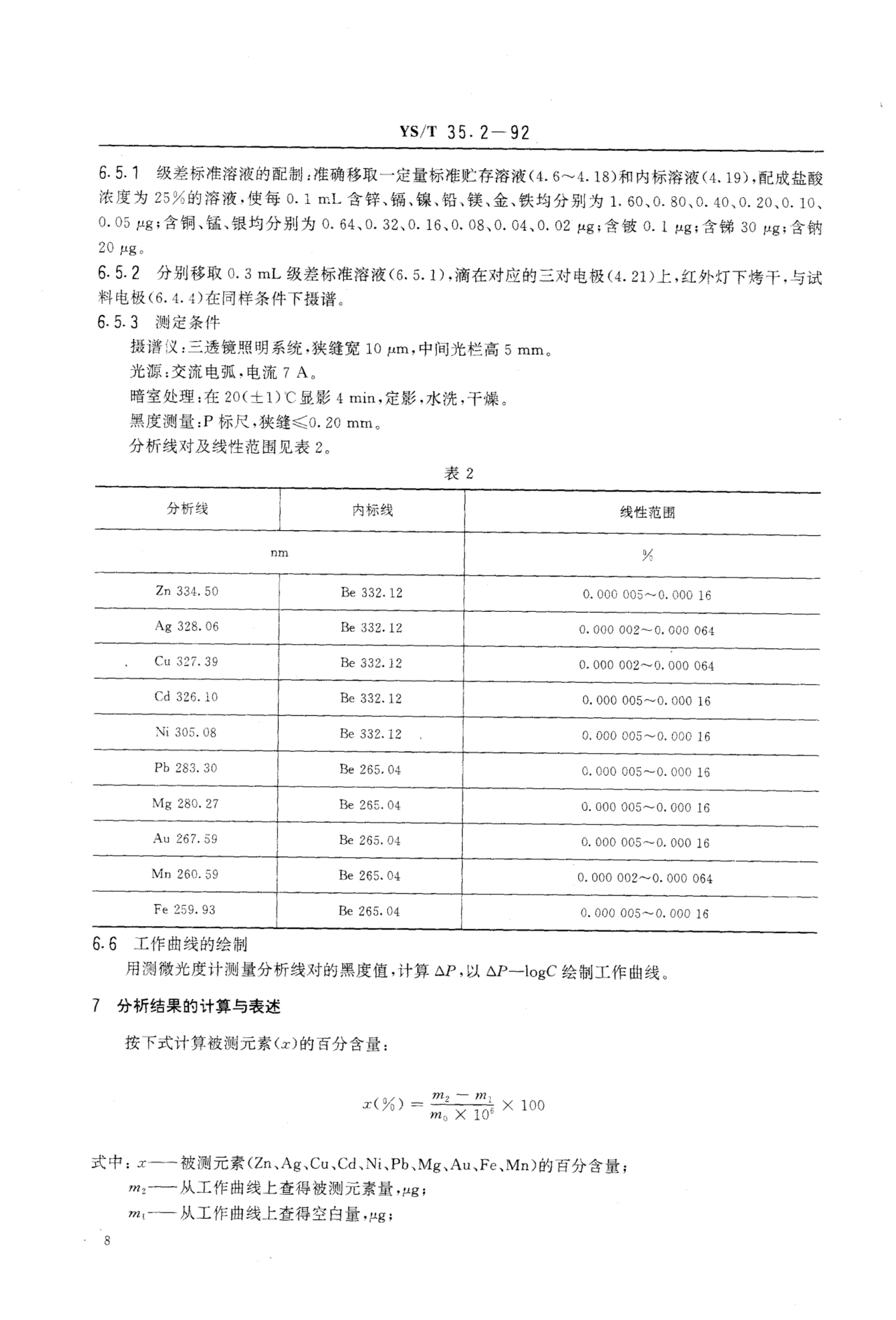 YS/T 35.2-1992 高纯锑化学分析方法化学光谱法测定锌,银,铜,镉,镍,铅,镁,金,铁和锰量