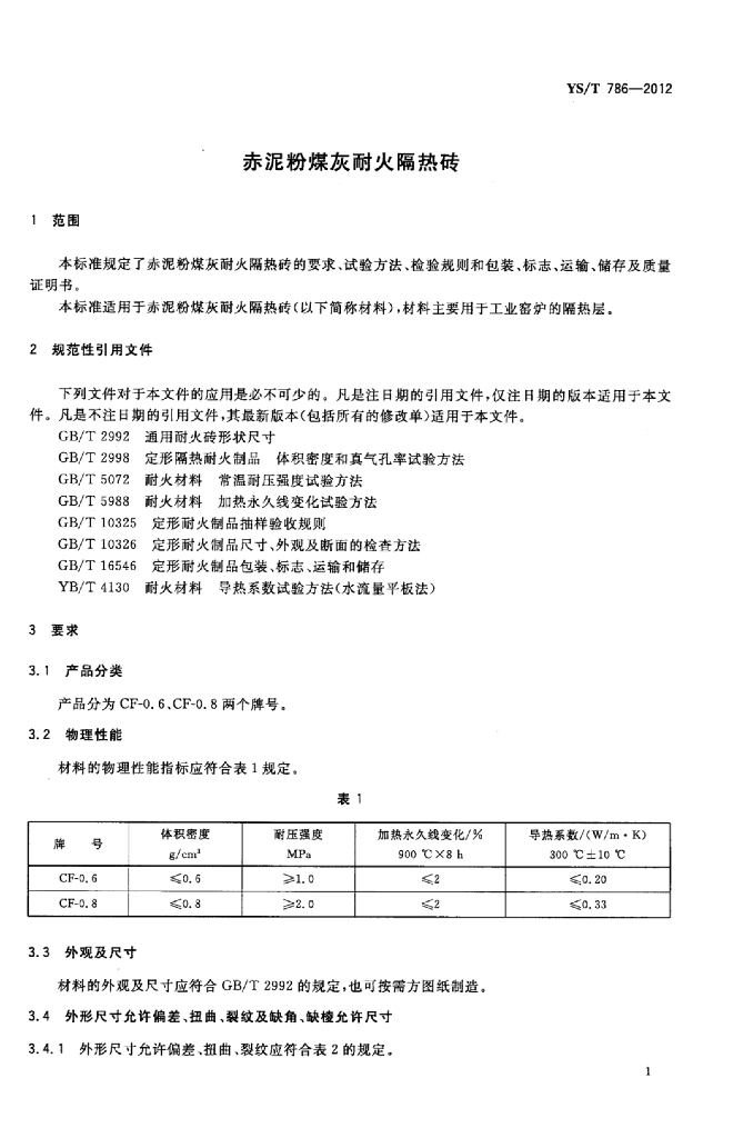 YS/T 786-2012 赤泥粉煤灰耐火隔热砖