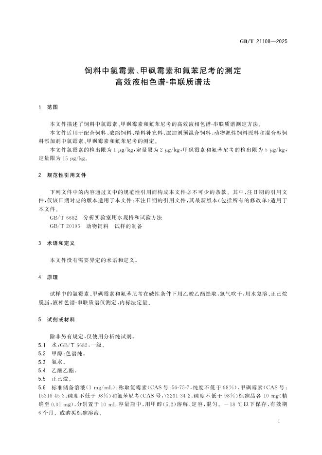 GB/T 21108-2025 饲料中氯霉素、甲砜霉素和氟苯尼考的测定 高效液相色谱-串联质谱法
