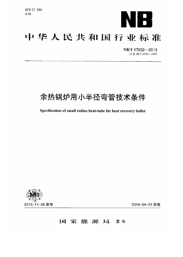 NB/T 47032-2013 余热锅炉用小半径弯管技术条件