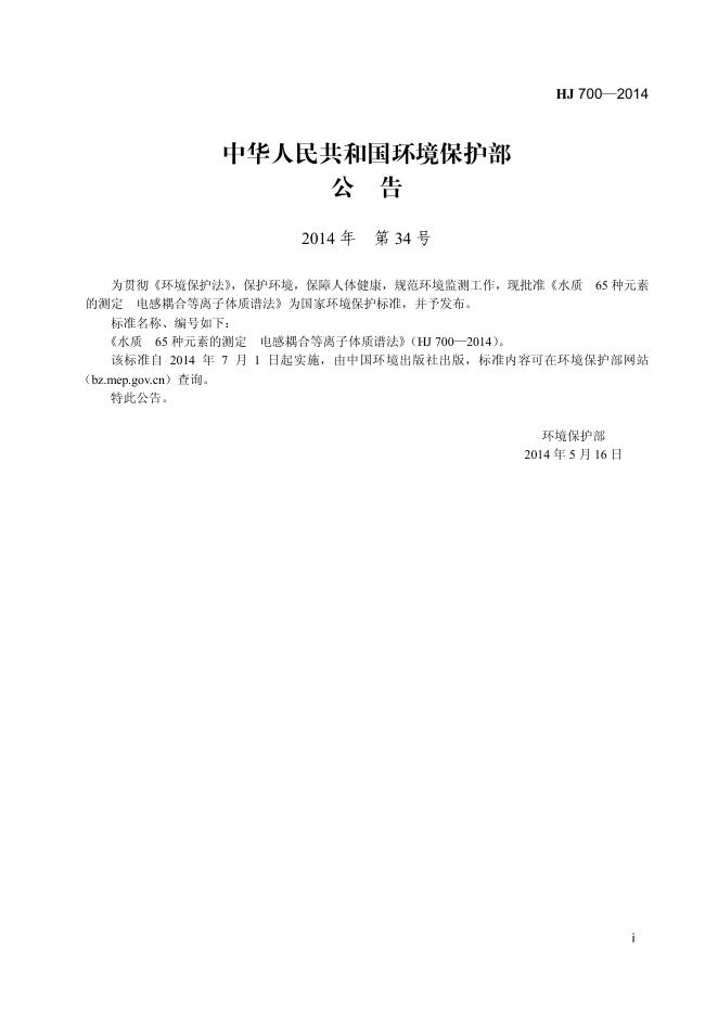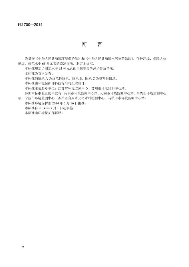 HJ 700-2014 水质 65种元素的测定 电感耦合等离子体质谱法