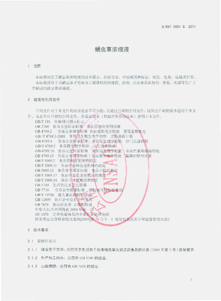 Q/KBT 0001S-2011 蛹虫草浓缩液