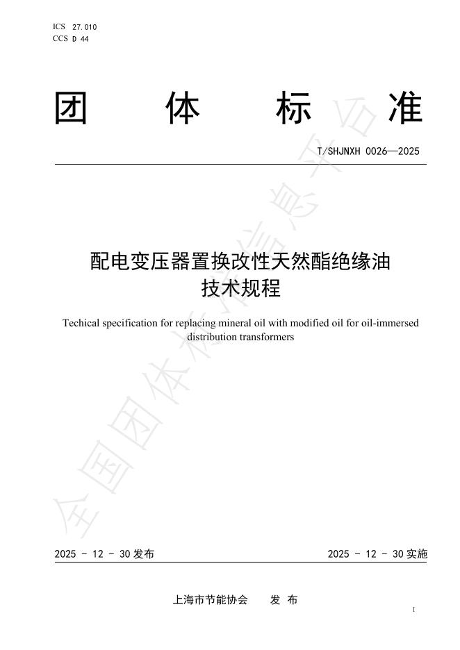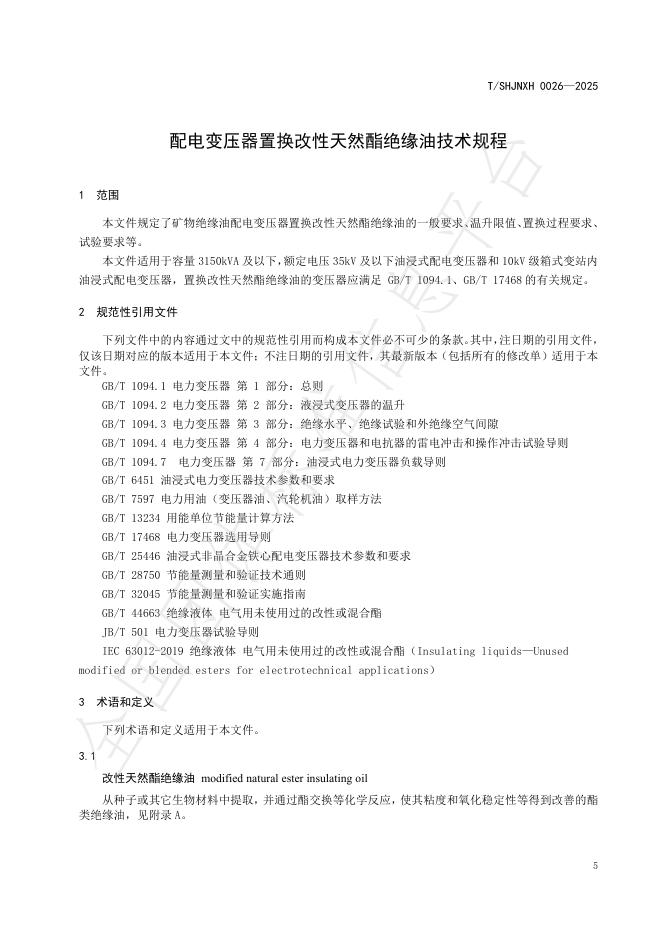 T/SHJNXH 0026-2025 配电变压器置换改性天然酯绝缘油技术规程
