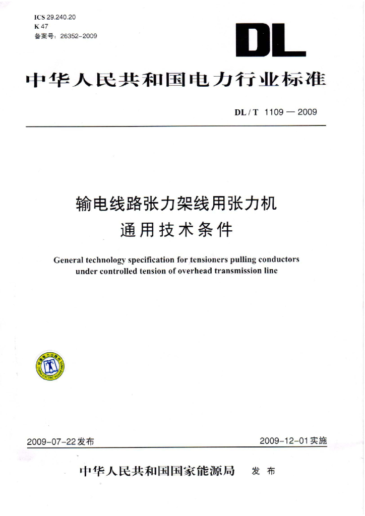 DL/T 1109-2009 输电线路张力架线用张力机通用技术条件
