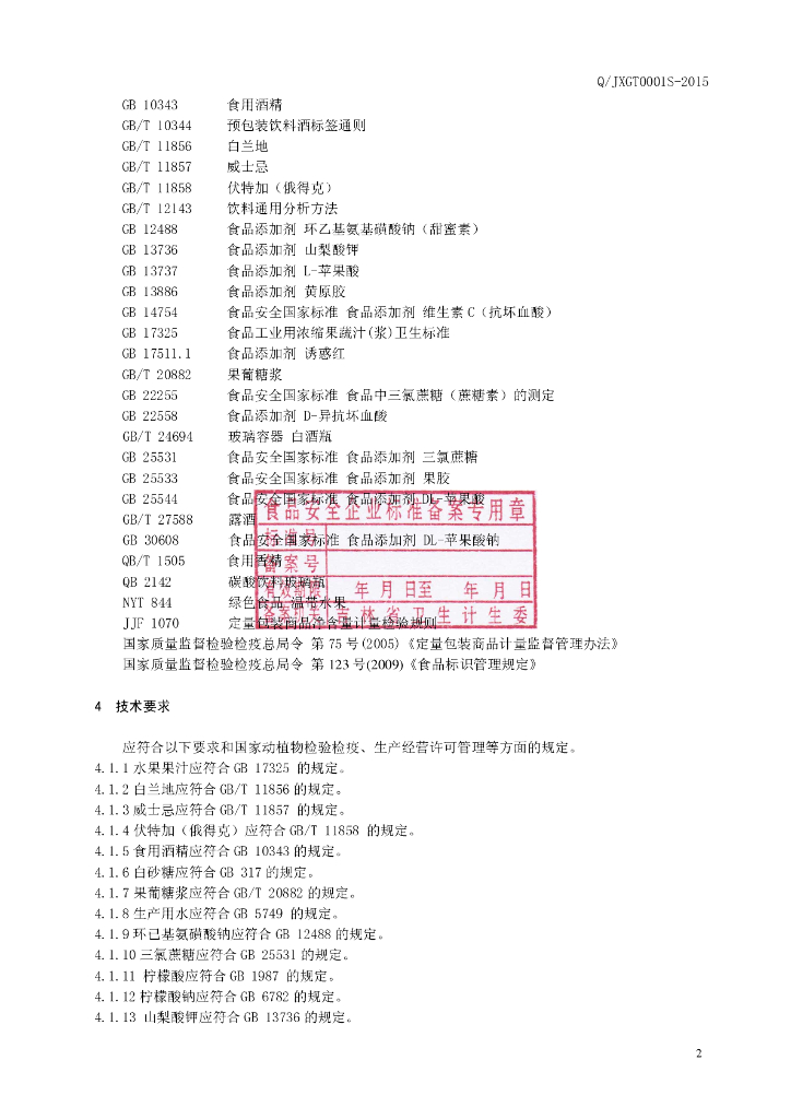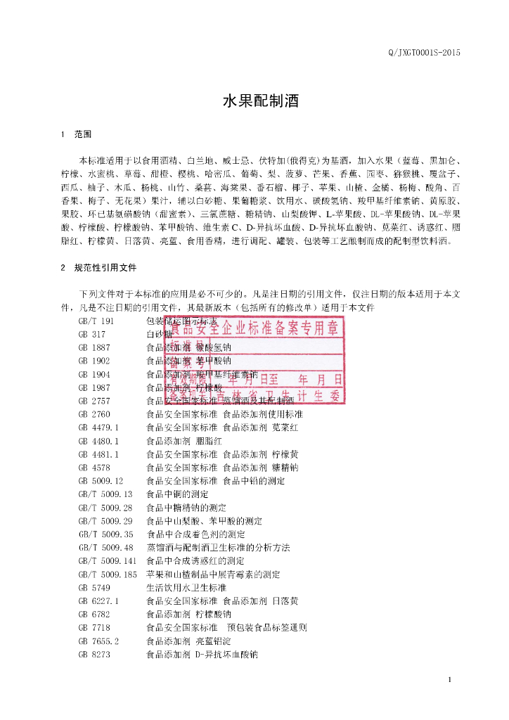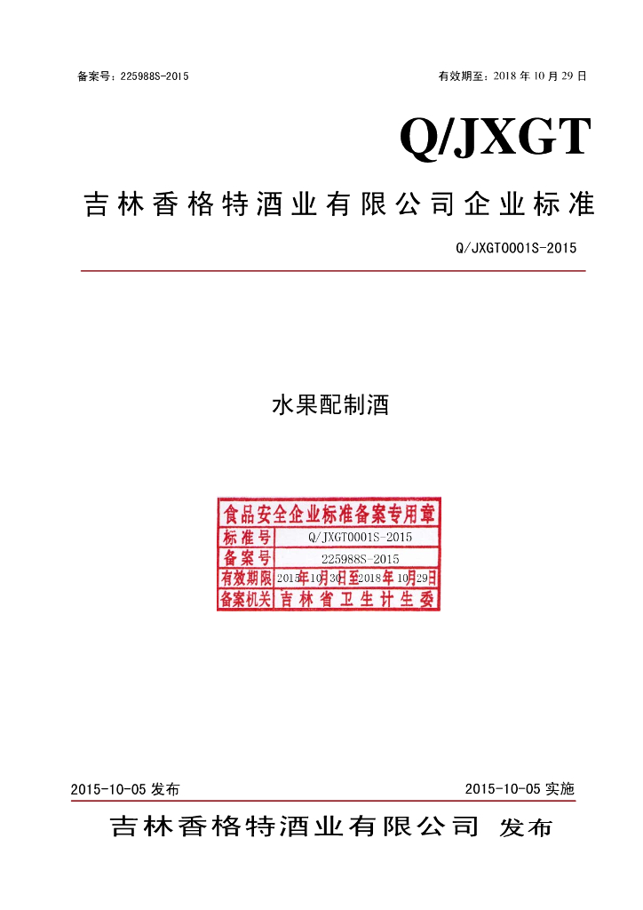 Q/JXGT 0001S-2015 吉林香格特酒业有限公司 水果配制酒