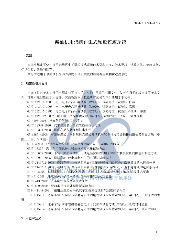 DB34/T 1793-2012 柴油机用燃烧再生式颗粒过滤系统