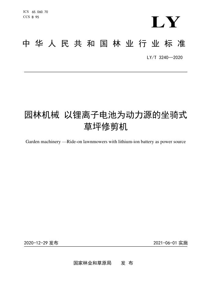 LY/T 3240-2020 园林机械 以锂离子电池为动力源的坐骑式草坪修剪机