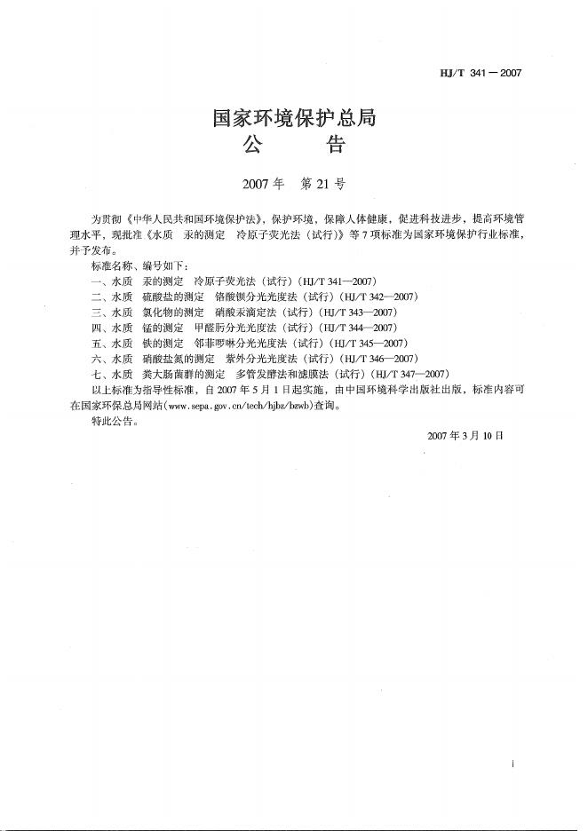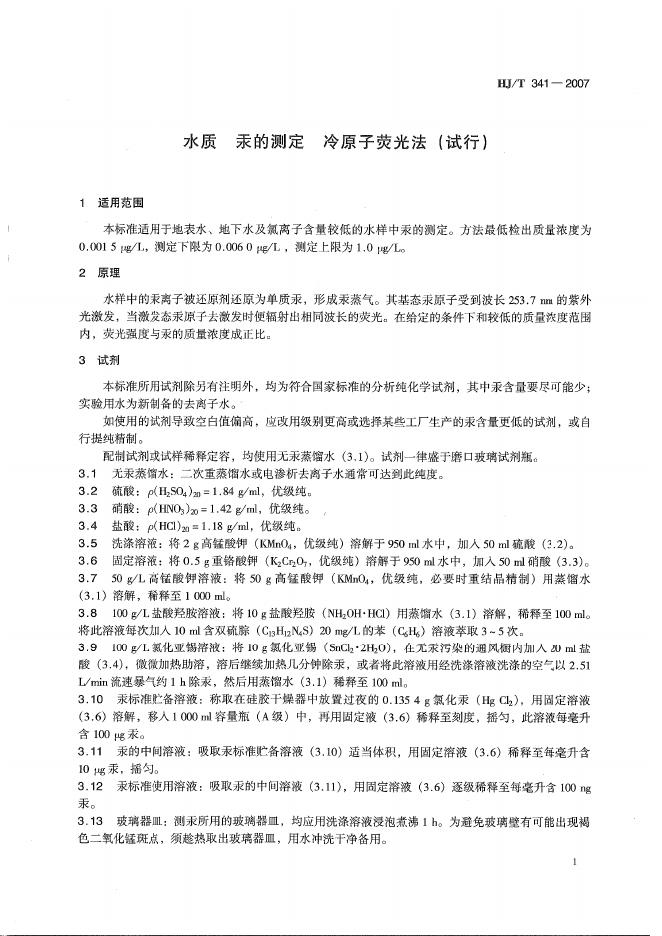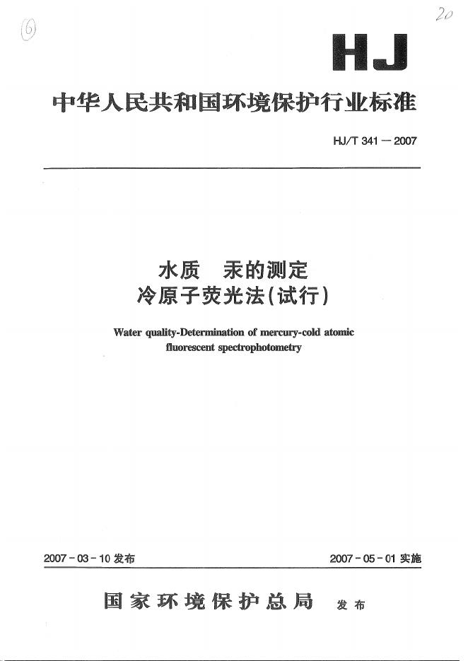 HJ/T 341-2007 水质 汞的测定 冷原子荧光法(试行)