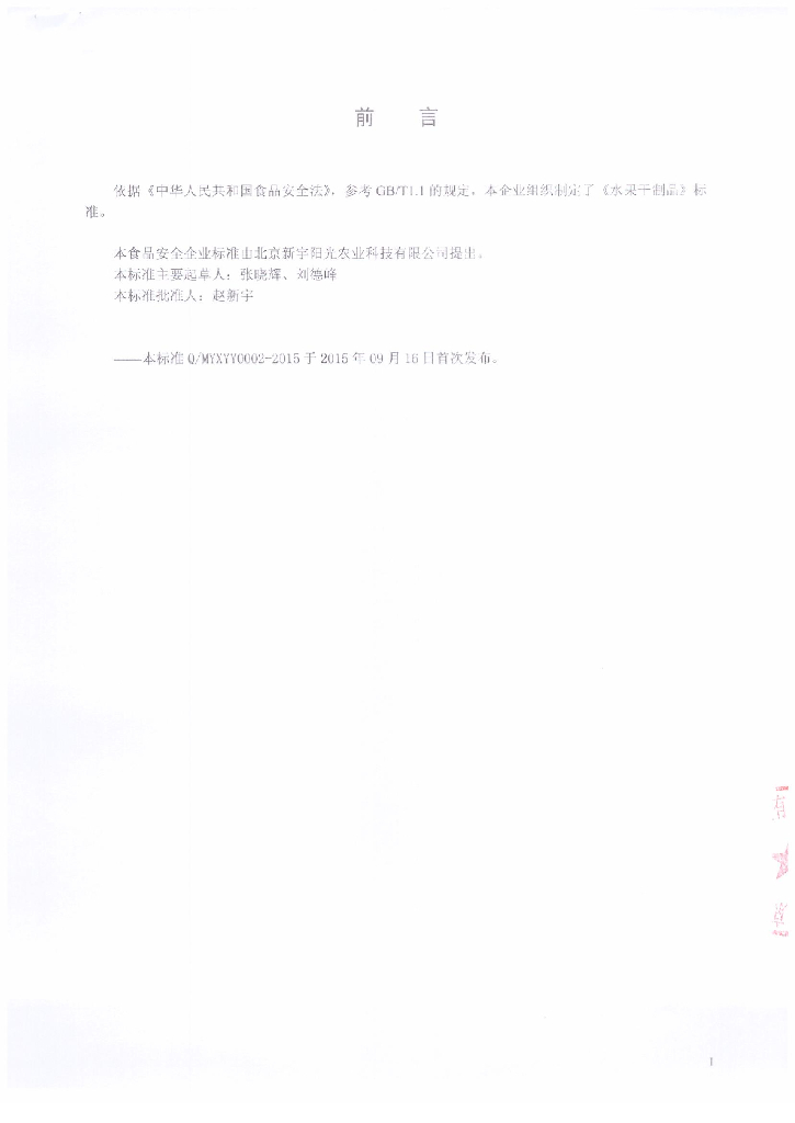Q/MYXYY 0002-2015 北京新宇阳光农业科技有限公司 水果干制品