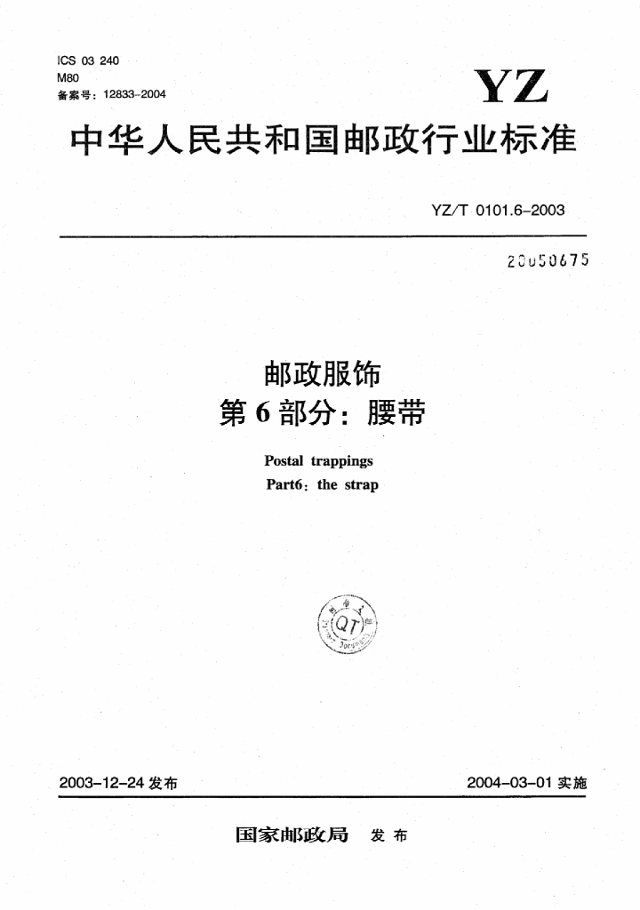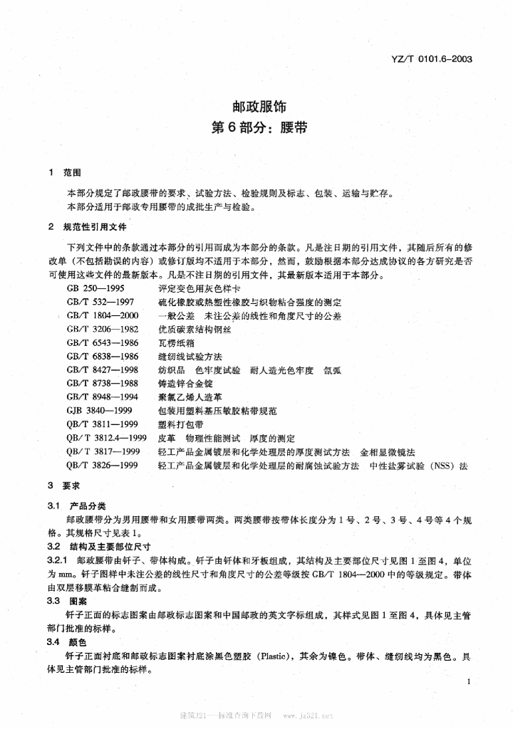 YZ/T 0101.6-2003 邮政服饰 第6部分:腰带