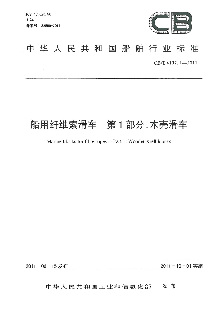 CB/T 4137.1-2011 船用纤维索滑车 第1部分:木壳滑车