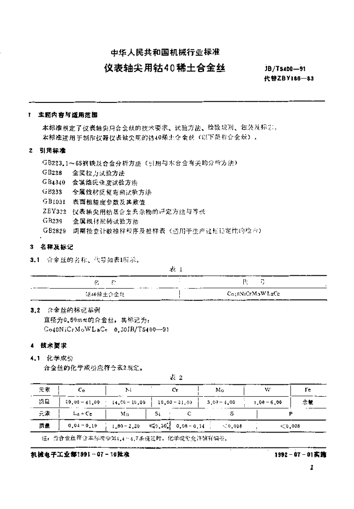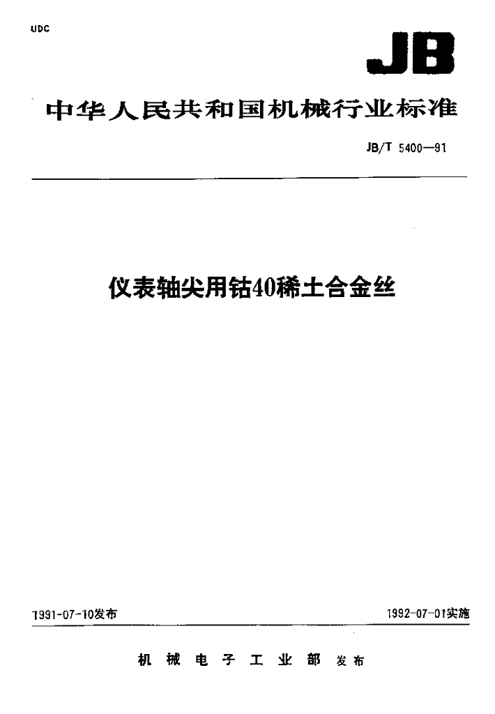 JB/T 5400-1991 仪表轴尖用钴40稀土合金丝