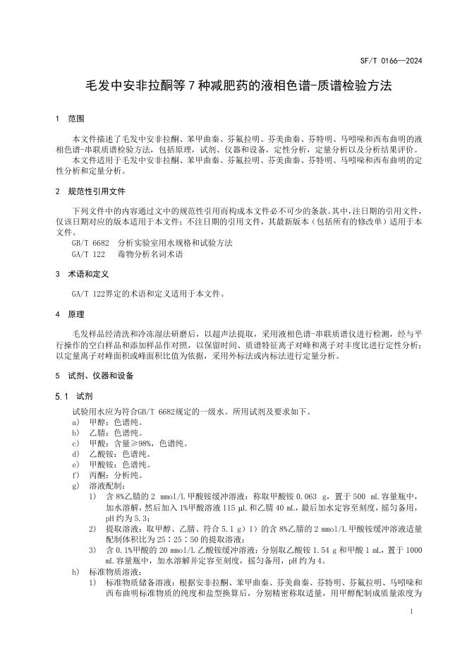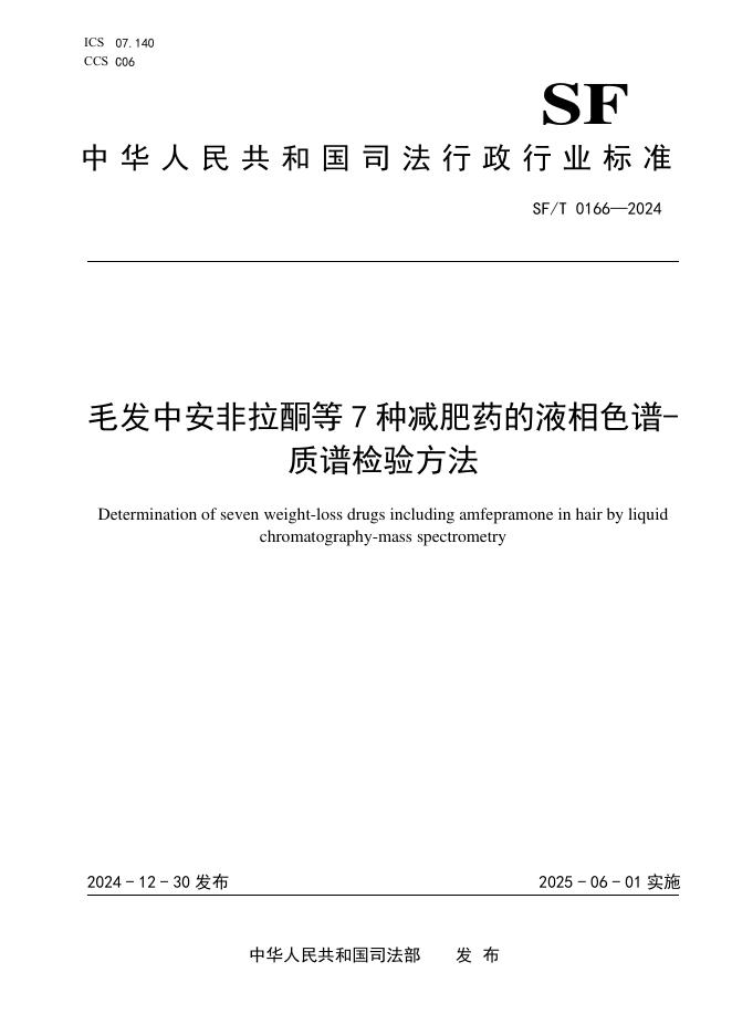 SF/T 0166-2024 毛发中安非拉酮等7种减肥药的液相色谱-质谱检验方法