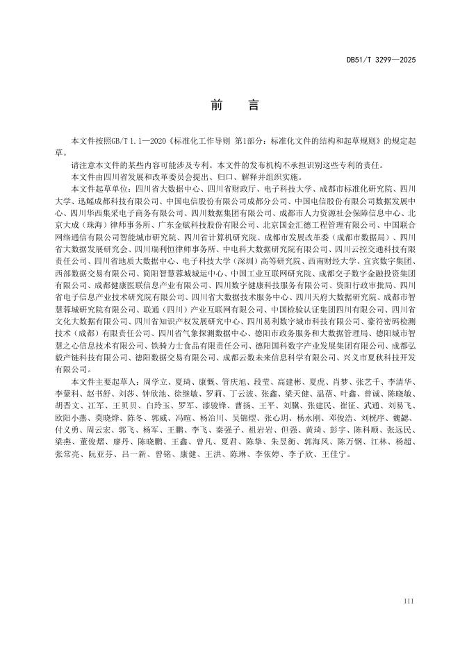 四川省大数据中心、四川省财政厅、电子科技大学、成都市标准化研究院、四川大学、迅鳐成都科技有限公司、中国电信股份有限公司成都分公司、中国电信股份有限公司数据发展中心、四川华西集采电子商务有限公司、四川数据集团有限公司、成都市人力资源社会保障信息中心、北京大成(珠海)律师事务所、广东金赋科技股份有限公司、北京国金汇德工程管理有限公司、中国联合网络通信有限公司智能城市研究院、四川省计算机研究院、成都市发展改革委(成都市数据局)、四川省大数据发展研究会、四川瑞利恒律师事务所、中电科大数据研究院有限公司、四川云控交