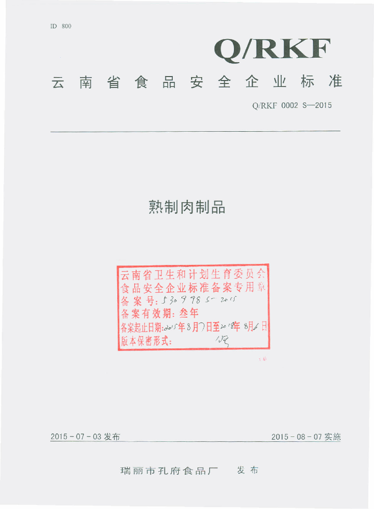 Q/RKF 0002S-2015 瑞丽市孔府食品厂 熟制肉制品