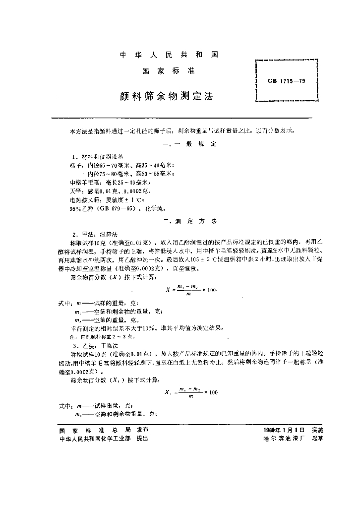 GB/T 1715-1979 颜料筛余物测定法