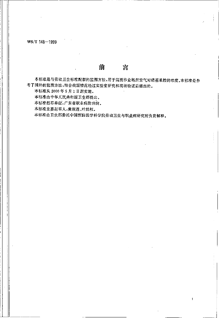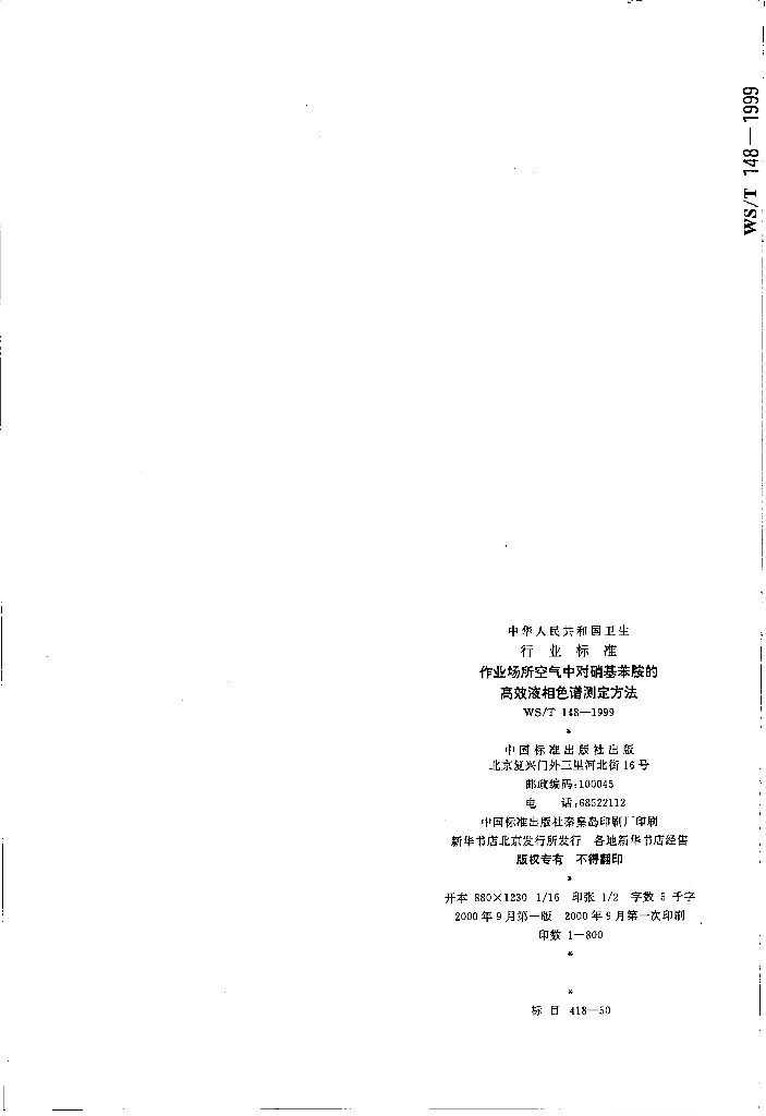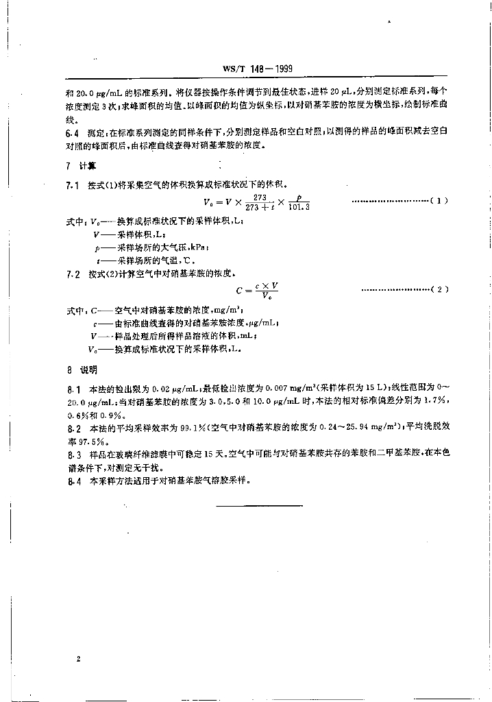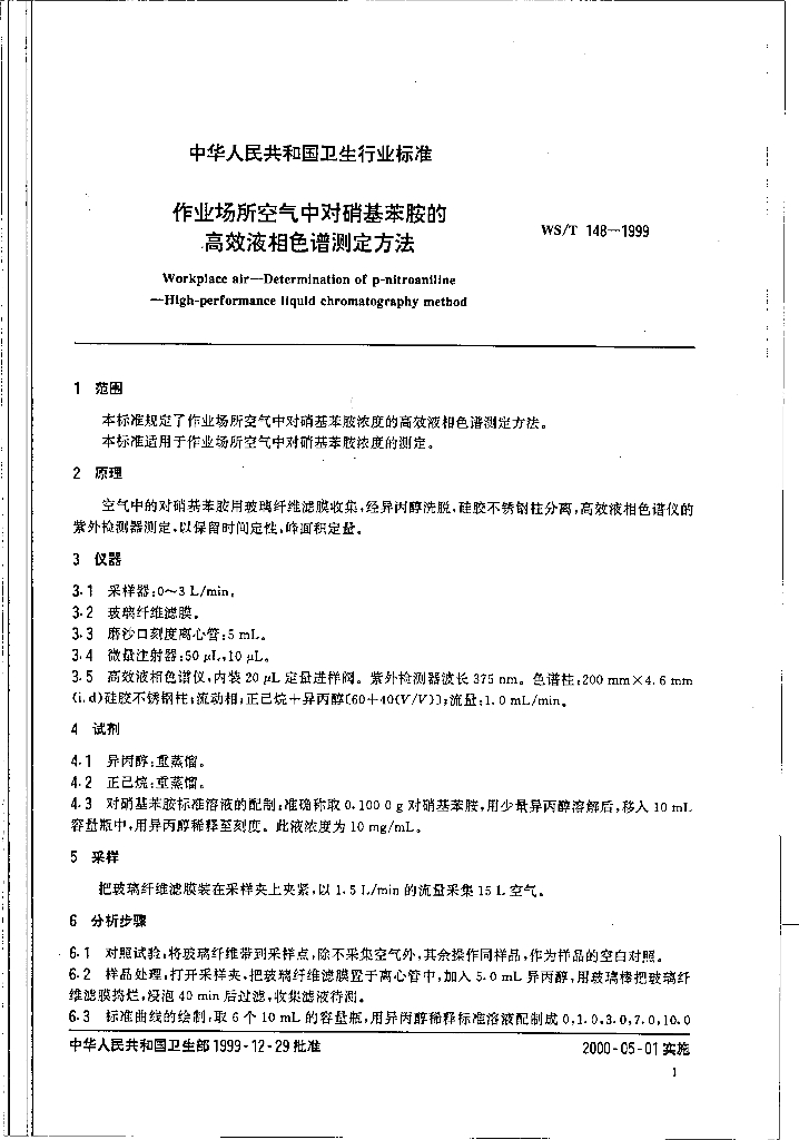 WS/T 148-1999 作业场所空气中对硝基苯胺的高效液相色谱测定方法