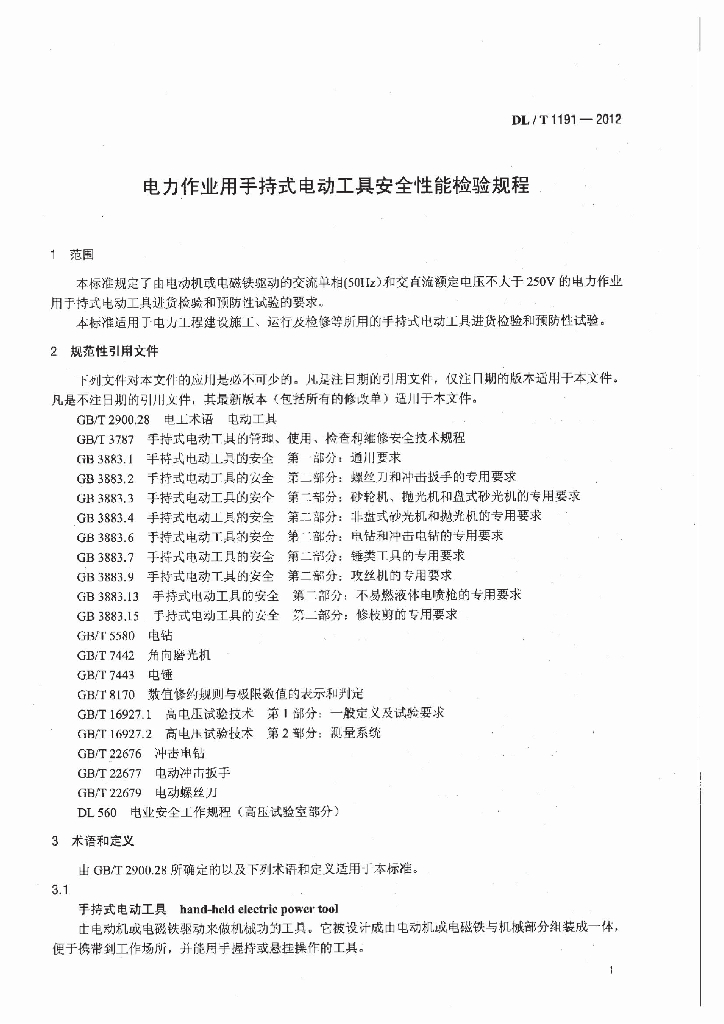 DL/T 1191-2012 电力作业用手持电动工具安全性能检验规程