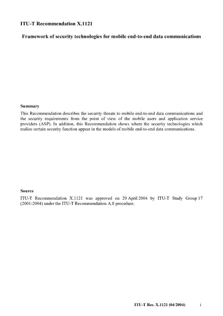 ITU-T X.1121-2004 移动端到端通信的安全技术的框架