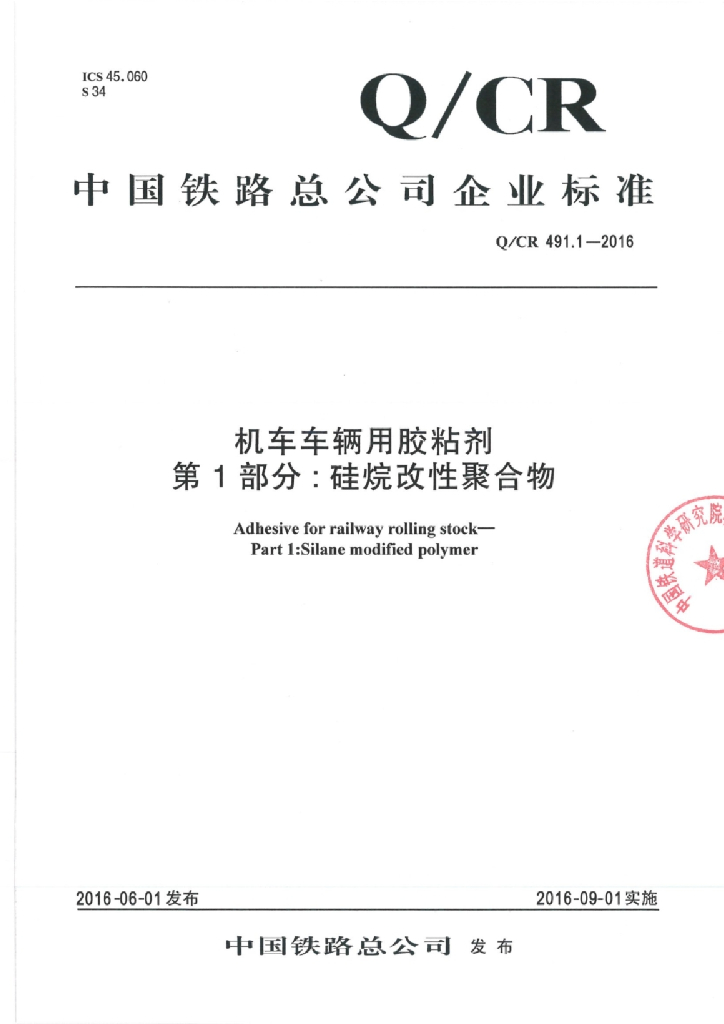 Q/CR 491.1-2016 机车车辆用胶黏剂 第1部分 硅烷改性聚合物