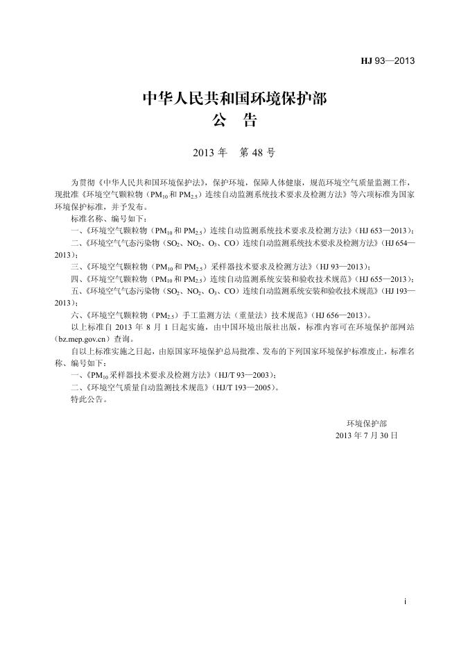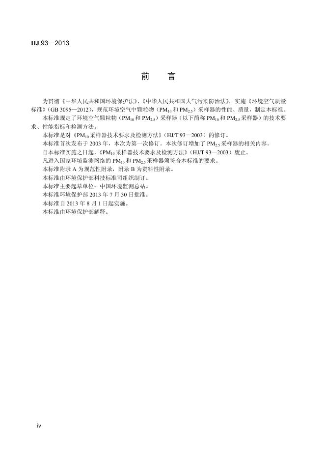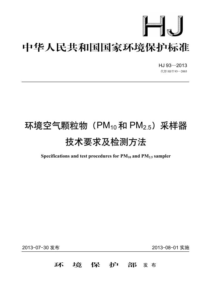 HJ 93-2013 环境空气颗粒物(PM10和PM2.5)采样器技术要求及检测方法