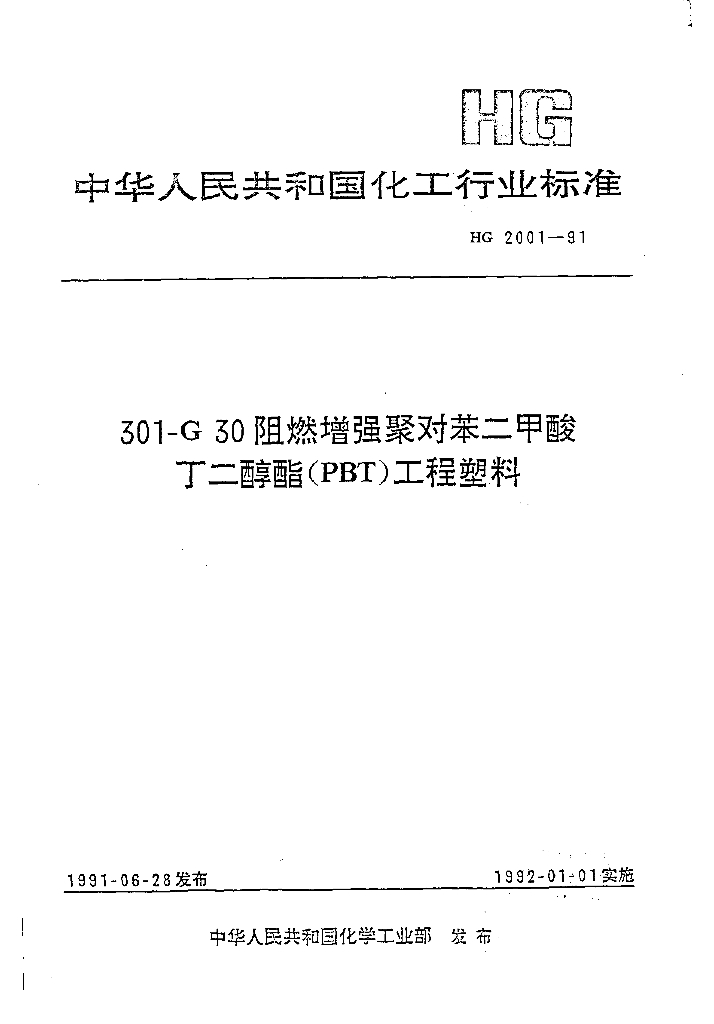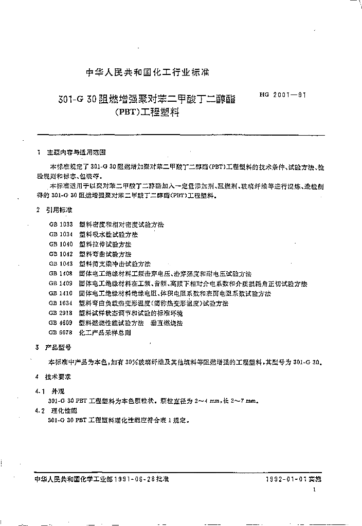 HG 2001-1991 301-G 30 阻燃增强聚对苯二甲酸丁二醇酯(PBT)工程塑料