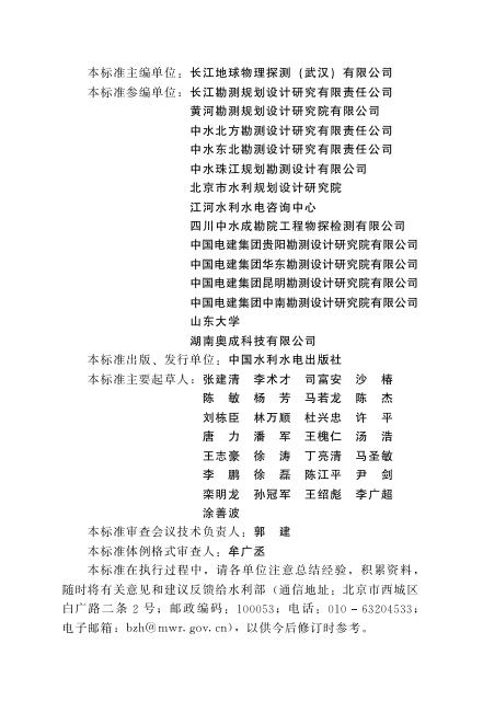 长江地球物理探测(武汉)有限公司、长江勘测规划设计研究有限责任公司、黄河勘测规划设计研究院有限公司、中水北方勘测设计研究有限责任公司、中水东北勘测设计研究有限责任公司、中水珠江规划勘测设计有限公司、北京市水利规划设计研究院、江河水利水电咨询中心、四川中水成勘院工程物探检测有限公司、中国电建集团贵阳勘测设计研究院有限公司、中国电建集团华东勘测设计研究院有限公司、中国电建集团昆明勘测设计研究院有限公司、中国电建集团中南勘测设计研究院有限公司、山东大学、湖南奥成科技有限公司
