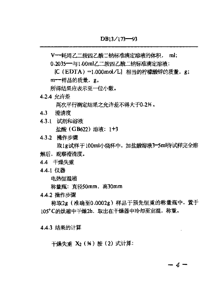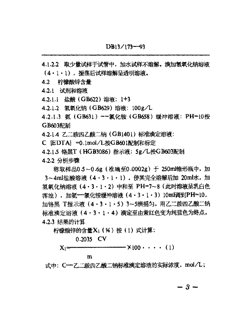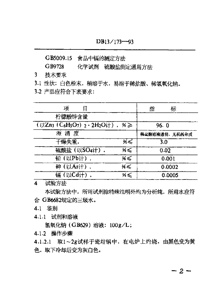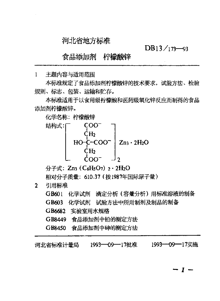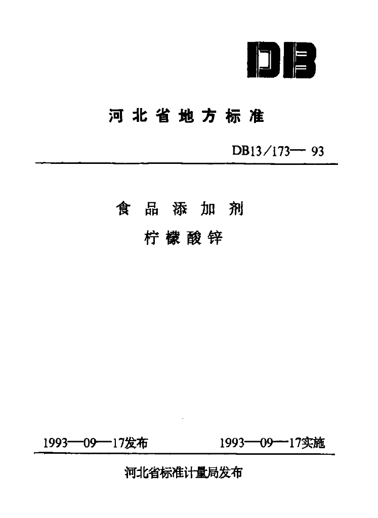 DB13/ 173-1993 食品添加剂 柠檬酸锌