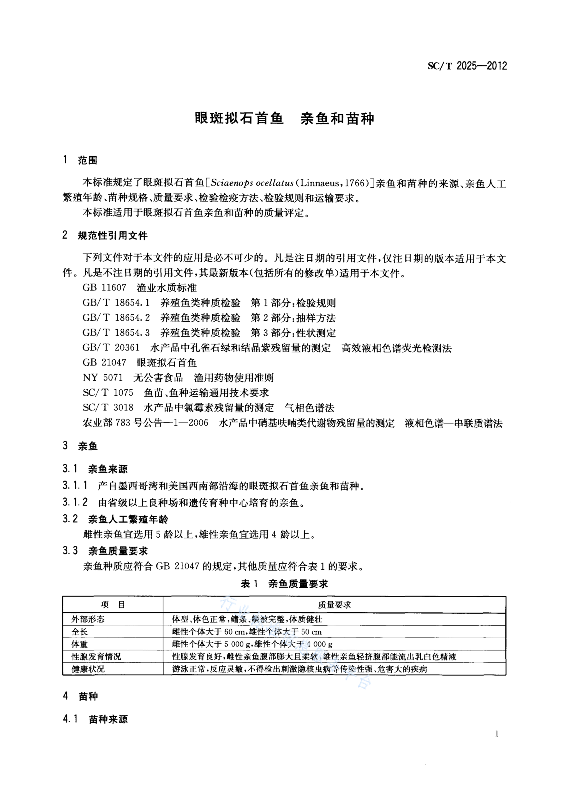 SC/T 2025-2012 眼斑拟石首鱼 亲鱼和苗种