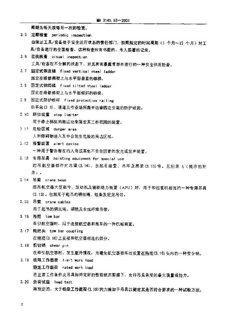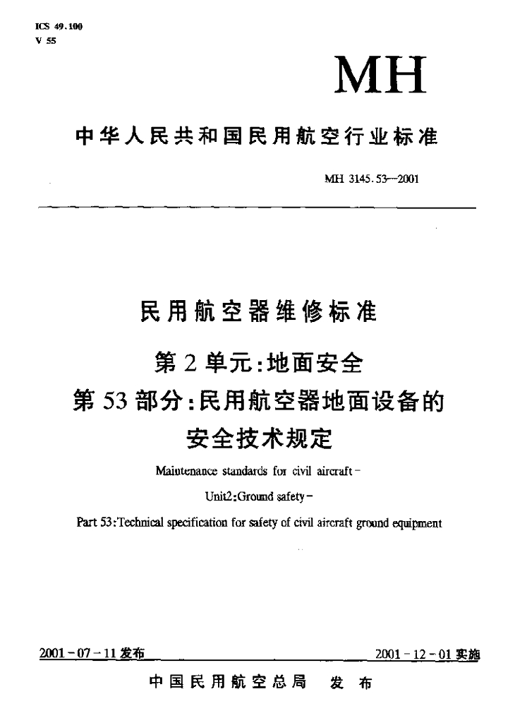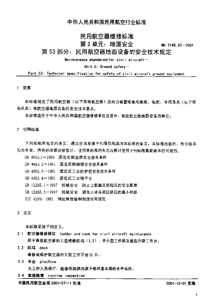 MH 3145.53-2001 民用航空器维修标准 第2单元 地面安全 第53部分 民用航空器地面设备的安全技术规定