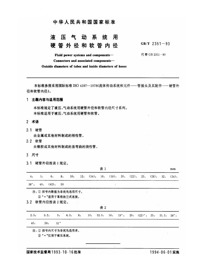 GB/T 2351-1993 液压气动系统用硬管外径和软管内径