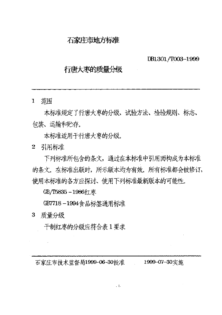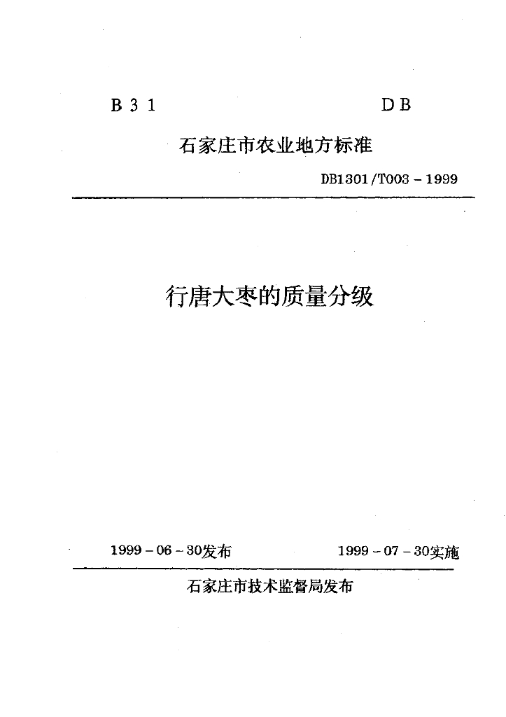 DB1301/T 003-1999 行唐大枣的质量分级